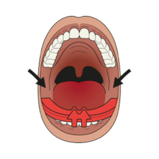 Schiene vor dem Spiegel mittig in den Mund auf die unteren Zähne legen. Mund langsam schließen und auf die Reinigungsschiene beißen, sodass sich die Zähne in den Kunststoff drücken. Den Mund für eine Minute geschlossen halten.